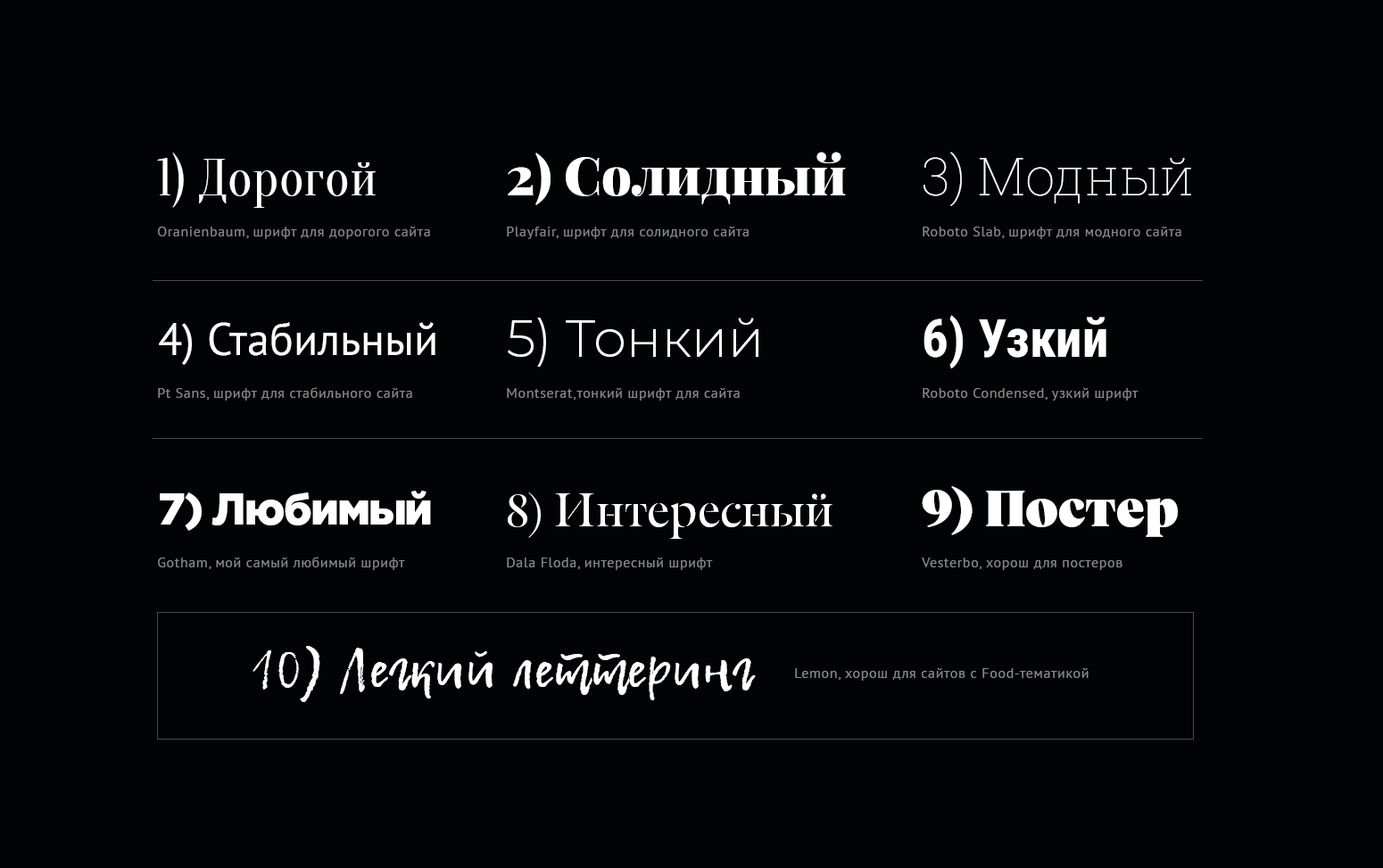 Количество шрифтов на сайте не должно быть более 3. Как правило – 1-2. Чтобы понять, какой шрифт подойдет вашей тематике, прикладываю картинку с начертанием шрифтов
