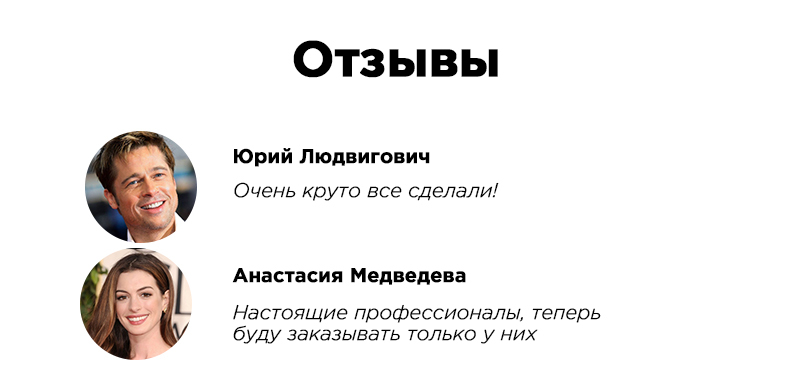 Ни в коем случае не делайте фейковые отзывы с фотографиями людей из интернета. Клиенты прекрасно понимают, когда их обманывают. Если у вас нет отзывов, можете попросить ваших друзей написать отзыв простыми словами, либо вообще откажитесь от этого блока на сайте.