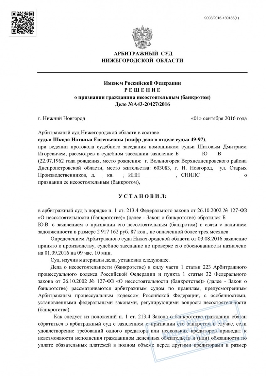 По завершении процедуры банкротства абсолютно все долги будут списаны на основании определения арбитражного суда.